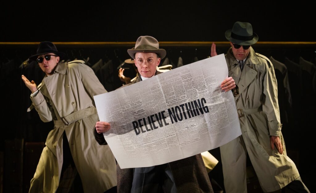 It is difficult not to like Emma Rice’s adaption of the Hitchcock movie, being so full of wit and invention. There is no fourth wall and the narrator – ‘and others’ – is a diminutive and ebullient Professor (Katy Owen) who weaves her way through the play. At one moment she might be acting as a kind of ‘Buttons’ character, jollying the audience along and at others with a hat here and a coat there filling in the gaps in casting (I quickly lost count of the number of minor characters played by the cast). The production, with help from the Professor, rushes along like an animated storyboard.