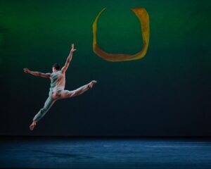 The final part of the programme, which takes up the whole of part two after the interval, is an apt choice since the composition is itself an attempt by Mussorgsky to capture in music the artistic work of his friend Hartmann; sketches, architectural drawings and theatre designs, forming part of a retrospective following his death. The set and costume designs use images by Kandinsky and – in the costumes at least (by Adeline André) – appear as a deconstructed artwork that comes together in various novel ways as the dancers interact.