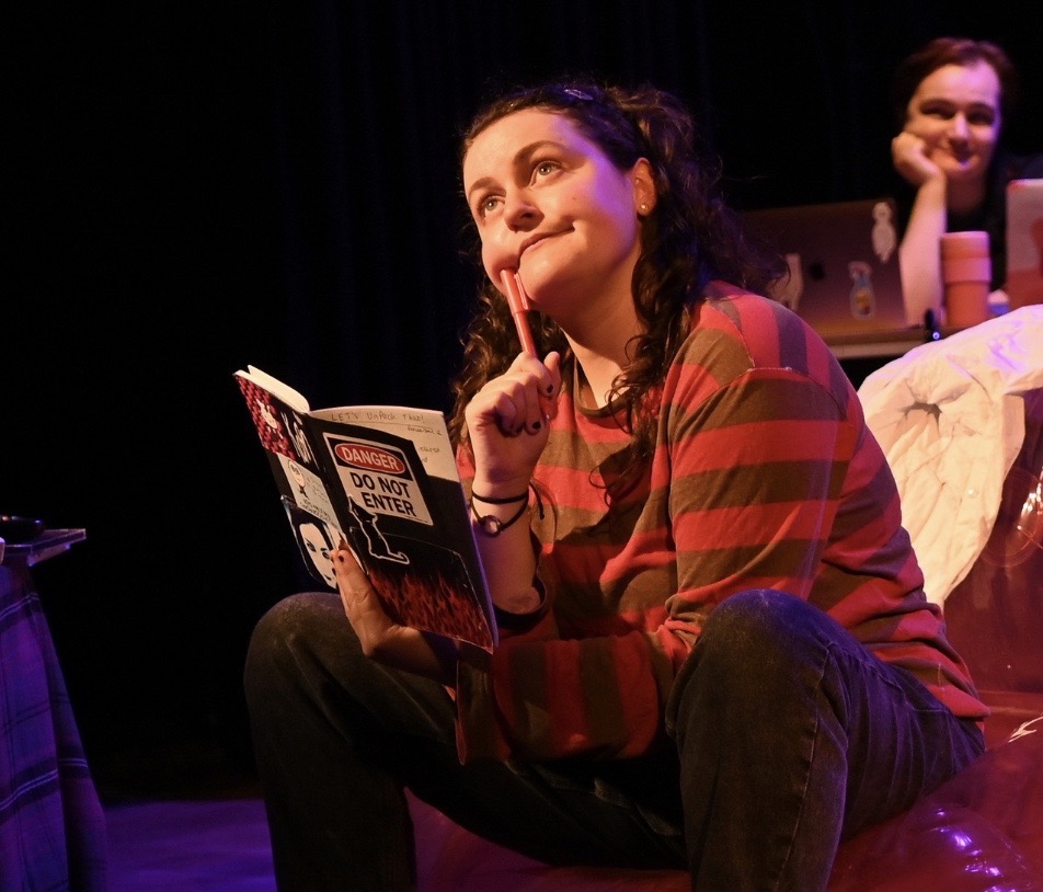 With a single bed, posters of Buffy the Vampire Slayer and My Chemical Romance on the wall and a blow-up pink plastic sofa as props, Rhodes was joined on stage by ‘Laptop Person’ Charlotte McEvoy acting as the visible tech aid. Behind and above her was a large screen that periodically heralded new directions in the plot, sometimes showing actual diary entries written by Tiffany’s 11- year- old hand, or BIG interests in her life at the time – Favourite Fictional Horses got a big laugh.