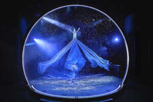 Tom Paris’s set – narrow concentric circles of white light on a largely dark background – had the look of a time piece that hinted at the warp between the real world and that of the fantastical Narnia, the only disappointment perhaps a lack of snow on the other side of the wardrobe, slightly undermining the idea of the White Witch’s power to inflict a hundred years of winter!