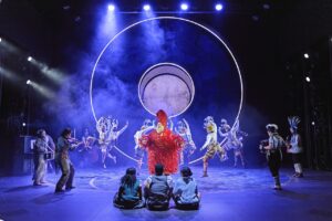 Remaining true to Lewis’s story, the narrative is bolstered by actor musicians who create both threatening and heart-warming atmospheres with accordion, guitar, fiddle, cello, double bass and clarinet, also singing in rich harmonies, while providing an extraordinarily disciplined and colourful ensemble around the main characters. Movement of the 20-plus cast was well orchestrated throughout by choreographer Shanelle ‘Tali’ Fergus, able to smoothly transition from the more intimate moments to the mayhem at the Stone Table.