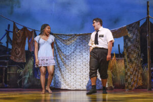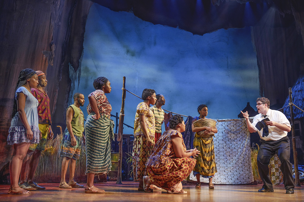 This odd couple find themselves transferred to a group of missionaries who are failing utterly to convert anyone in Northern Uganda, and the show’s clever scenic design swiftly transports the action from glossy Salt Lake City to a shabby, disease-ridden Ugandan village. When the villagers sing an upbeat number entitled Hasa Diga Eebowai there are seeming echoes of Hakuna Matata from The Lion King, but The Lion King it is not. The song has a very different meaning from ‘no worries,’ with middle fingers defiantly pointing skywards to a God that has brought nothing but misery.