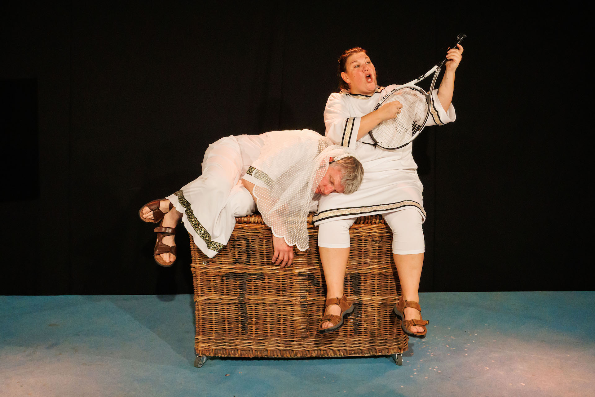 With a set comprising a large wicker basket containing a motley array of childish props with several more strapped to the pillars, McLoughlin and Rudd count down the myths on a video monitor at the side of the stage. Their comic invention operates at full tilt and along the way we meet a jazz poet Hades, spitting rhymes in the underworld, an over-muscled Heracles fighting the Minotaur before speeding away from Ariadne’s dubious charms in a toy motorboat, Orpheus playing air-lute on a tennis racket to soothe the rabid three-headed dog Cerberus. And then there is fleet-footed Hermes, the messenger. Only he has been rebranded as ‘Evri’ and his ability to deliver as efficiently as the god has similarly been downgraded.
