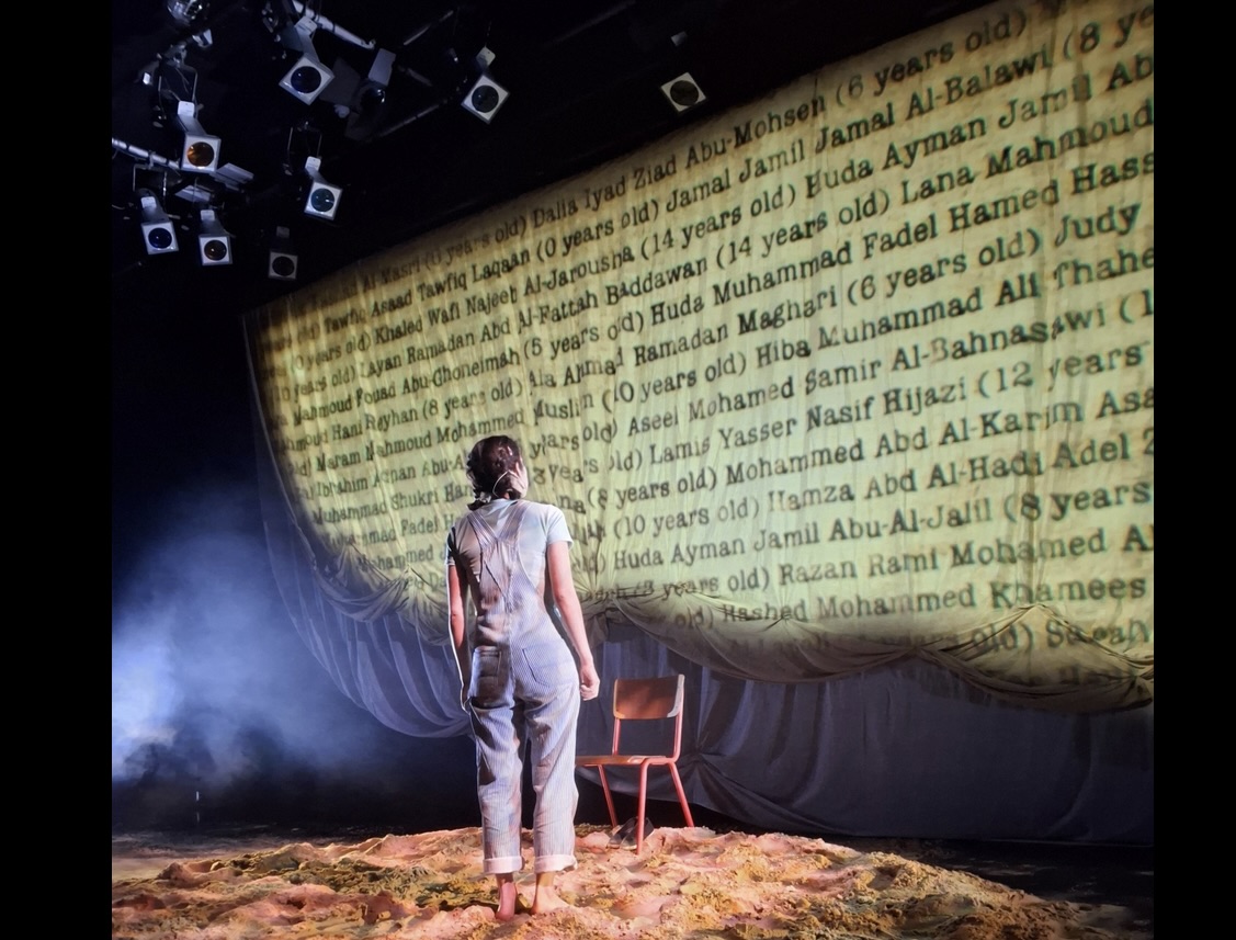 Sarah Agha, as Renad, is an eleven-year-old girl sitting on a mound of sand, but not the golden, silky type depicted in a fantasy AI image of Gaza as a new luxury beach resort. Instead, it is a temporary resting place for a lonely, frightened child while Israeli fighter jets scream overhead. The action occurs in the years after the war launched in the aftermath of the October 2023 attack by Hamas.